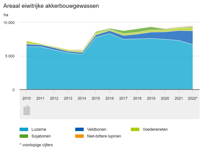 The protein-rich crops take up about 0,5 percent of the total Dutch agricultural area. The area mainly consists of alfalfa. The area of alfalfa has been decreasing for a number of years. In 2022, the area will be 6,7 thousand hectares, 8% less than a year earlier. Alfalfa is used as cattle feed and as green manure.