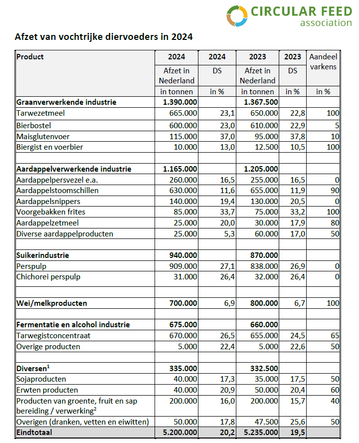Samen vormen deze producten bijna 95% van de afzet van vochtrijke diervoeders. De totale hoeveelheid vochtrijke voedermiddelen komt overeen met bijna 1,2 miljoen ton droge voedergrondstoffen.