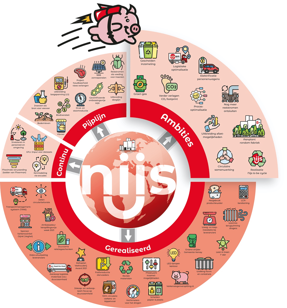 John Geurts, directeur Nijsen company: “Planet, People, Profit en Partnership vormen de gids in onze bedrijfsvoering. Door reststromen uit de voedingsmiddelenindustrie te gebruiken wordt er geen landbouwgrond gebruikt voor veevoeders, ontbossing tegengegaan en een grote reductie van de CO2-voetafdruk voor onze klanten gerealiseerd. De welbekende Ladder van Moerman geeft weer hoe we de planeet kunnen beschermen door reststromen optimaal te benutten. Dagelijks brengen wij 400.000 kg aan levensmiddelen terug in de voedselkringloop.”